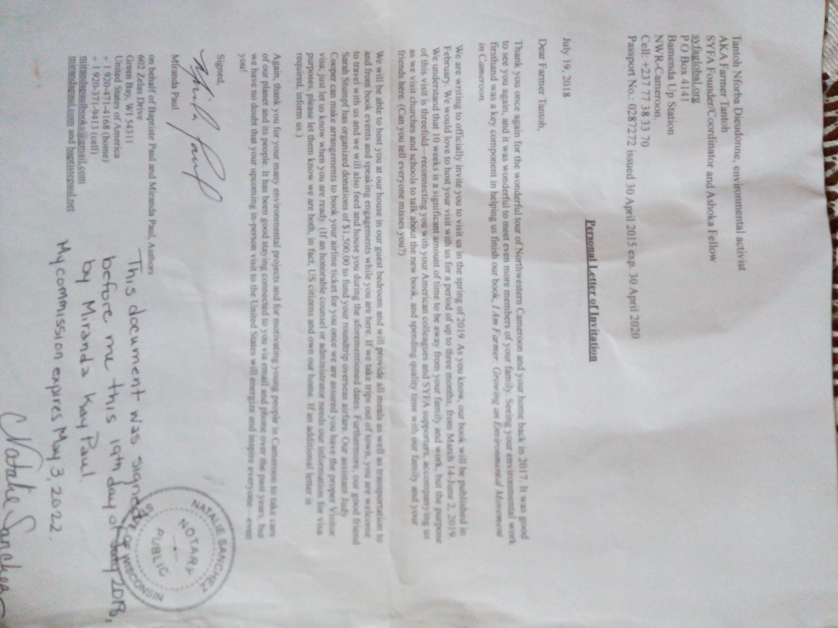 > I am therefore writing if each and everyone of you could please drop a note at the Consular Section of the US Embassy in Cameroon to appeal to them to reconsider my situation and grant my visa? Miranda and other networks in USA have written to the Ambassador in Cameroon as well. The email of the consular section is consularyaounde at state.gov <mailto:consularyaounde at state.gov>