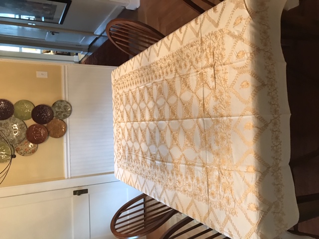 Beautiful white cloth with gold embroidery, six matching napkins, from Margaret’s travels in Pakistan.