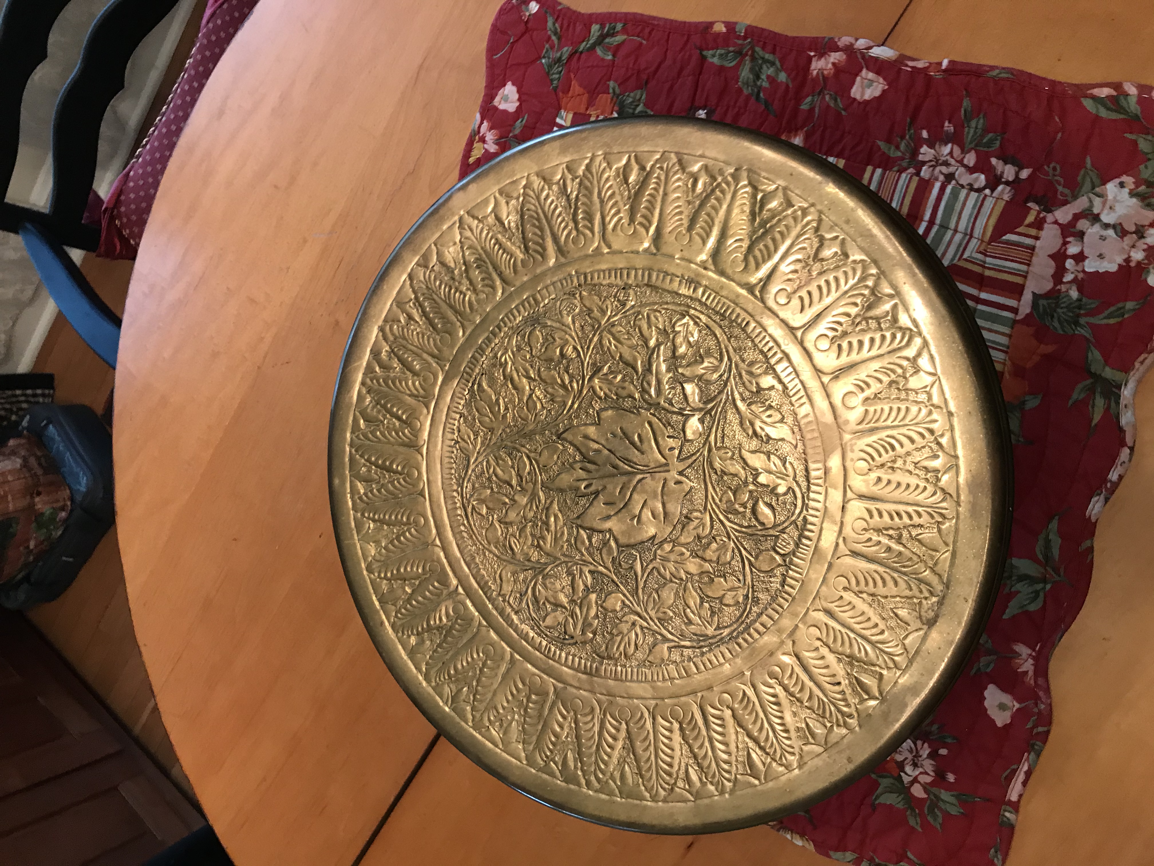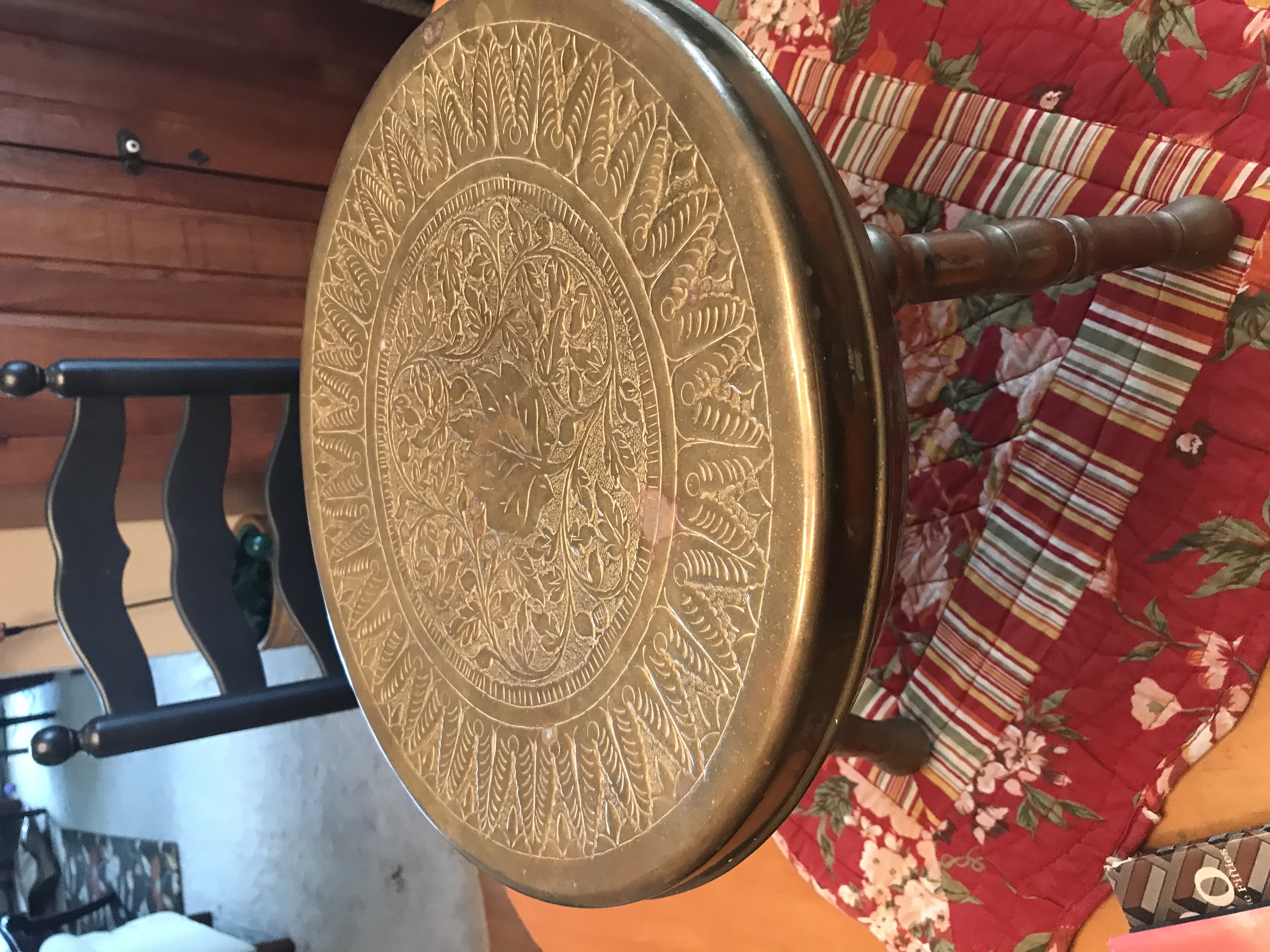Also from Margaret’s travels In Pakistan, this three legged beautifully decorated brass stool is approximately 13 inches in height and diameter.