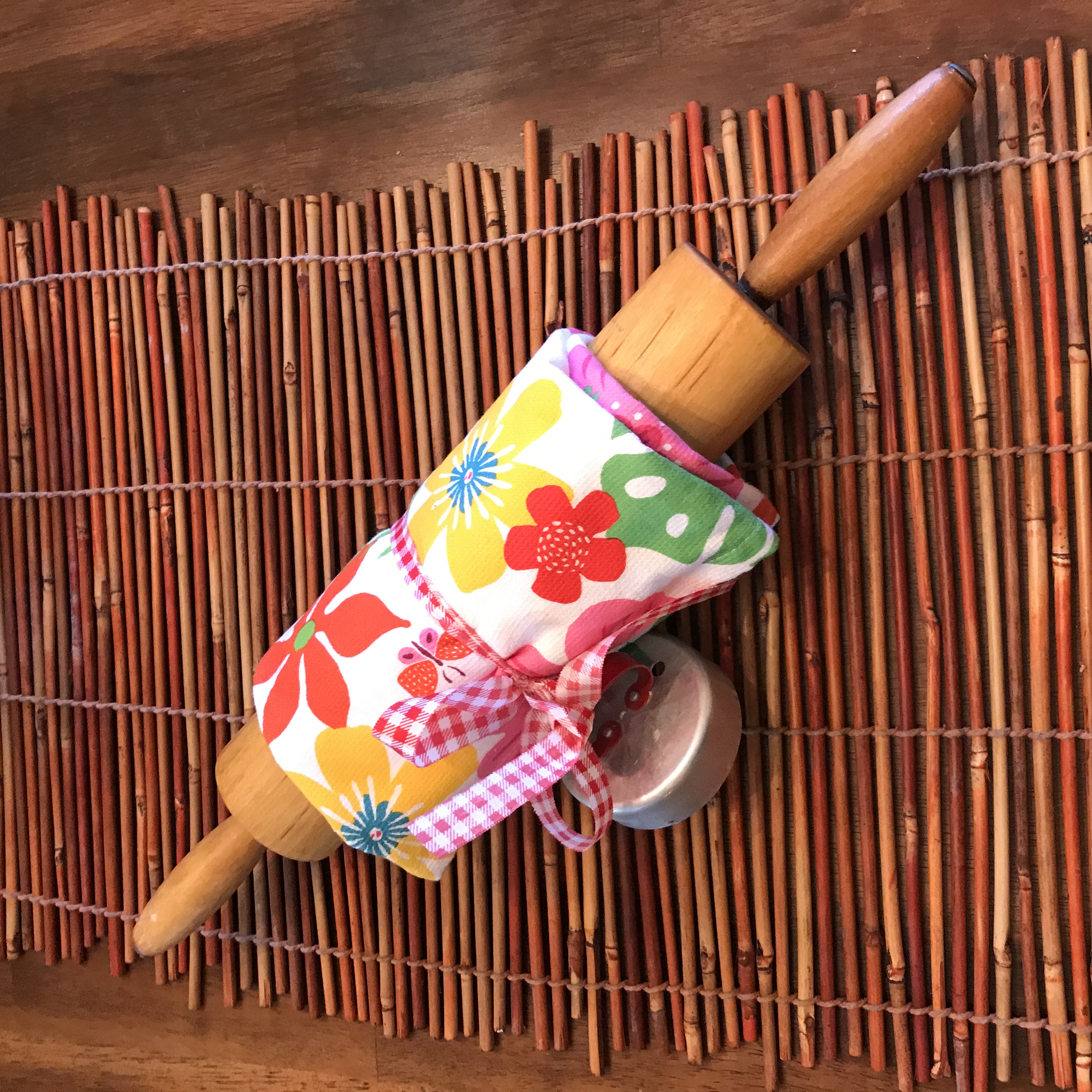 Just in time for your holiday baking! Margaret’s well loved wooden rolling pin, wrapped in a brand new tea towel with a metal biscuit/cookie cutter attached.