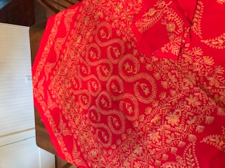1. 50” square red embroidered cloth from Pakistan, with 6 napkins.