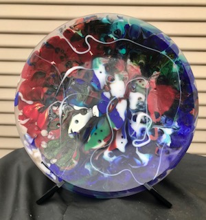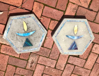 Below are photos of the UU Chalice stained glass mosaic garden stones and the fused & slumped glass art bowl Bruce has made for the auction.